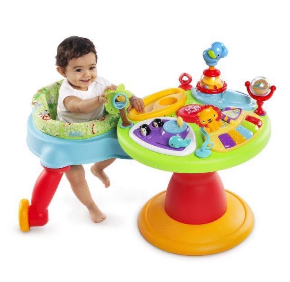 Bright Starts Around We Go Baby Activity Station is the only product of its kind designed to grow with baby through the toddler years. Featuring an innovative seat that rotates 360 degrees around the table top to give babies full access to all toys and activities!